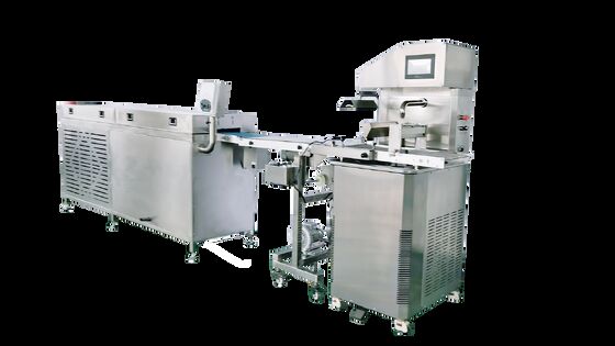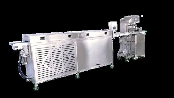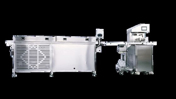 El túnel de enfriamiento integrado es la clave de la eficiencia. Proporciona un entorno de enfriamiento controlado y continuo, lo que permite que los productos de chocolate templado se fijen perfectamente en cuestión de minutos. Esto agiliza su producción, elimina la necesidad de estaciones separadas de templado y fijación, y maximiza la producción en un espacio reducido.